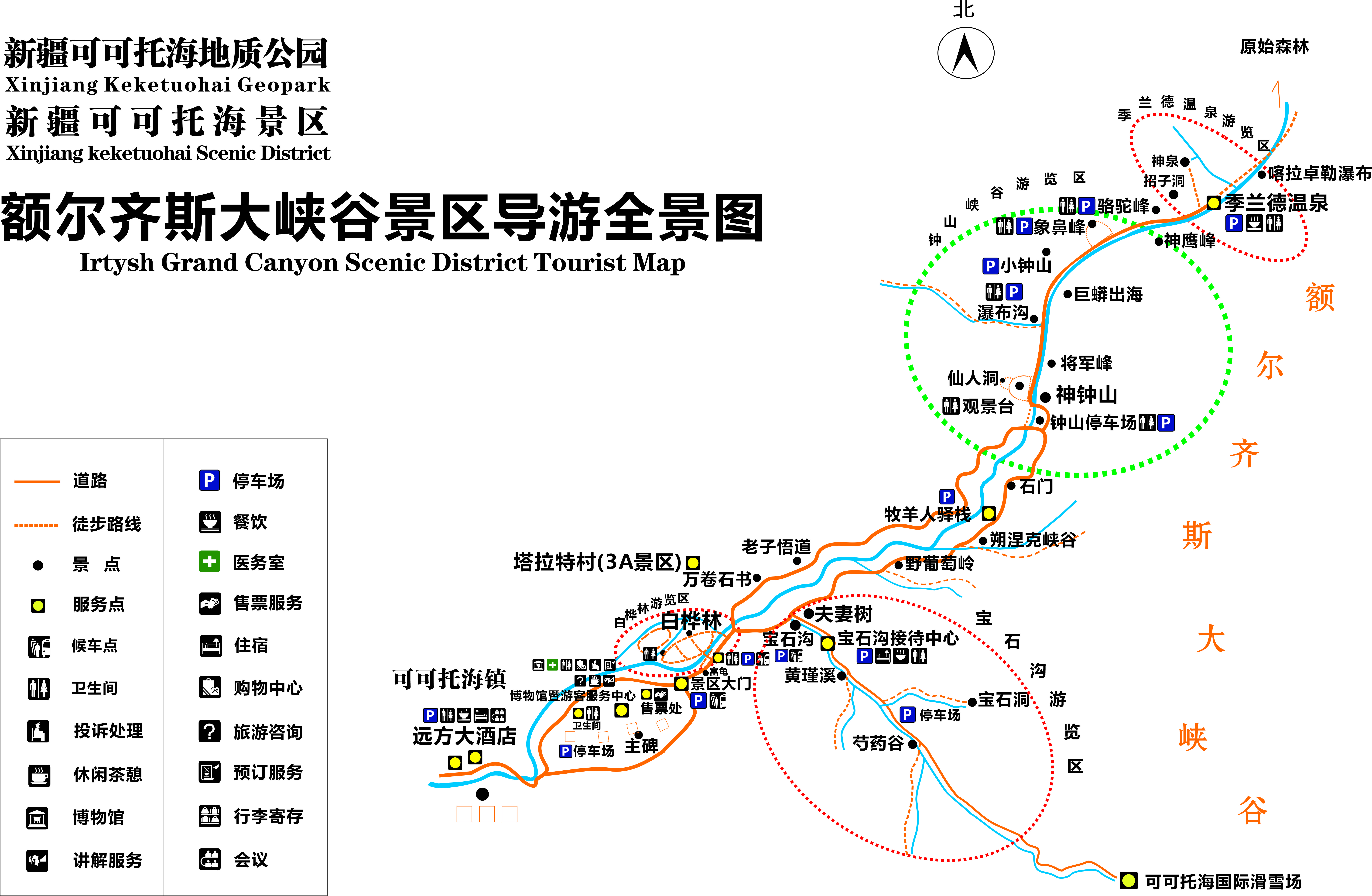 可可托海景区位于中、蒙、哈三国边境线内侧,天池—卡拉麦里保护区—可可托海—喀纳斯黄金旅游线上,景区总面积788平方公里。额尔齐斯大峡谷是典型的伟晶岩地貌,额尔齐斯河的源头,幽幽的白桦树,皑皑的雪山,一望无际的原始森林,广懋的夏牧场,密集的溪流,灵动的湖泊,丰富的野生动物,浩浩荡荡的转场,雄壮的神钟山及其美丽的传说,构成了一个国内罕有的自然、人文奇观。其中,相对高差365米的阿米尔萨拉峰最为神奇,因其形似钟,故称“神钟山”。这里还孕育了很多“中国第一,世界唯一”。如世界保存最完整的地震断裂带遗址、世界罕见的地质圣坑、世界唯一的额尔齐斯石、中国宝石之乡等等。